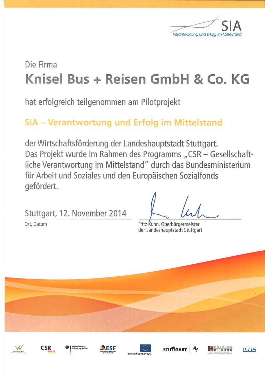 CSM Urkunde für Nachhaltige UnternehmenskulturNachhaltig wirtschaften, fair mit Mitarbeiterinnen und Mitarbeitern umgehen, verantwortungsvoll handeln – das ist soziale Unternehmensverantwortung. Knisel Bus + Reisen, mit Firmensitz in Stuttgart-Mühlhausen, ist nicht nur Pilotbetrieb im VVS-Projekt Nachhaltige Mobilität in der Region Stuttgart (NaMoReg), sondern gehört auch zu 25 Pilotunternehmen aus der Landeshauptstadt Stuttgart, die drei Jahre lang einen maßgeschneiderten Beratungs- und Qualifizierungsprozess durchlaufen haben. Gemeinsam mit der Wirtschaftsförderung der Landeshauptstadt Stuttgart, der uve GmbH Managementberatung und dem Kolping Bildungswerk wurde das CSR-Projekt (Corporate Social Responsibility) durchgeführt und im Herbst 2014 erfolgreich abgeschlossen.